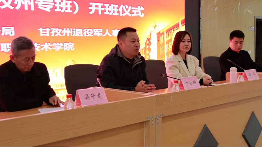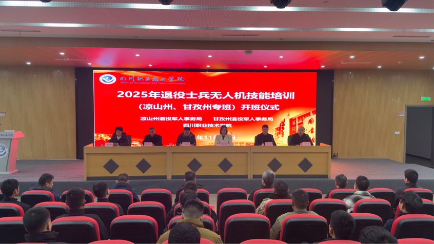 2025年11月18日,2025年退役士兵无人机技能培训(凉山州、甘孜州专班)开班仪式在四川职业技术学院汽车学院隆重举行。凉山州退役军人事务局副局长丁金钟 、安置就业科科长吴子龙,四川职业技术学院副校长徐凤、继续教育学院院长赵伟、团委副书记学工部负责人董雪梅、汽车学院院长刘瑞军等领导出席活动。来自凉山州、甘孜州的50余名退役士兵参加仪式。