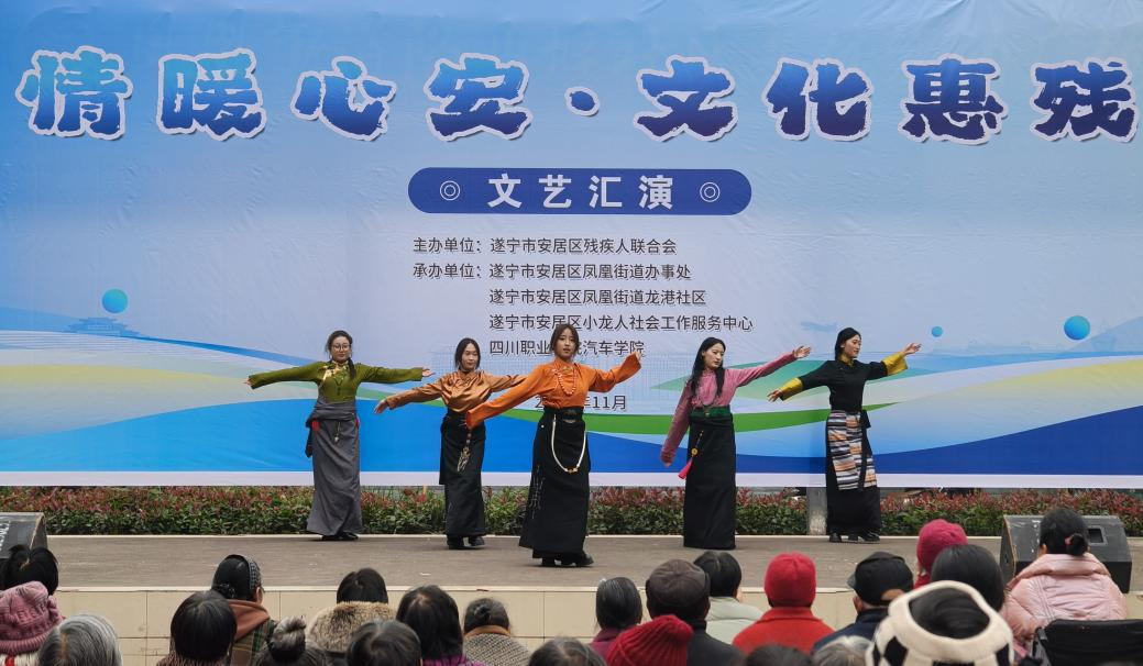 为响应社会关爱残疾人的号召,践行“青春志愿,爱在社区”的公益理念,11月22日,由遂宁市安居区残疾人联合会主办,凤凰街道办事处、龙港社区、小龙人社会工作服务中心及四川职业技术学院汽车学院联合承办的“情暖心安 文化惠残”主题慰问活动,分别在安居区东城花宛小区广场、刘家坝小区广场温情上演。两场精彩的文艺汇演,为当地残疾人朋友送去了满满的关爱与欢乐,让青春力量与社区温情在残健融合中绽放光芒。