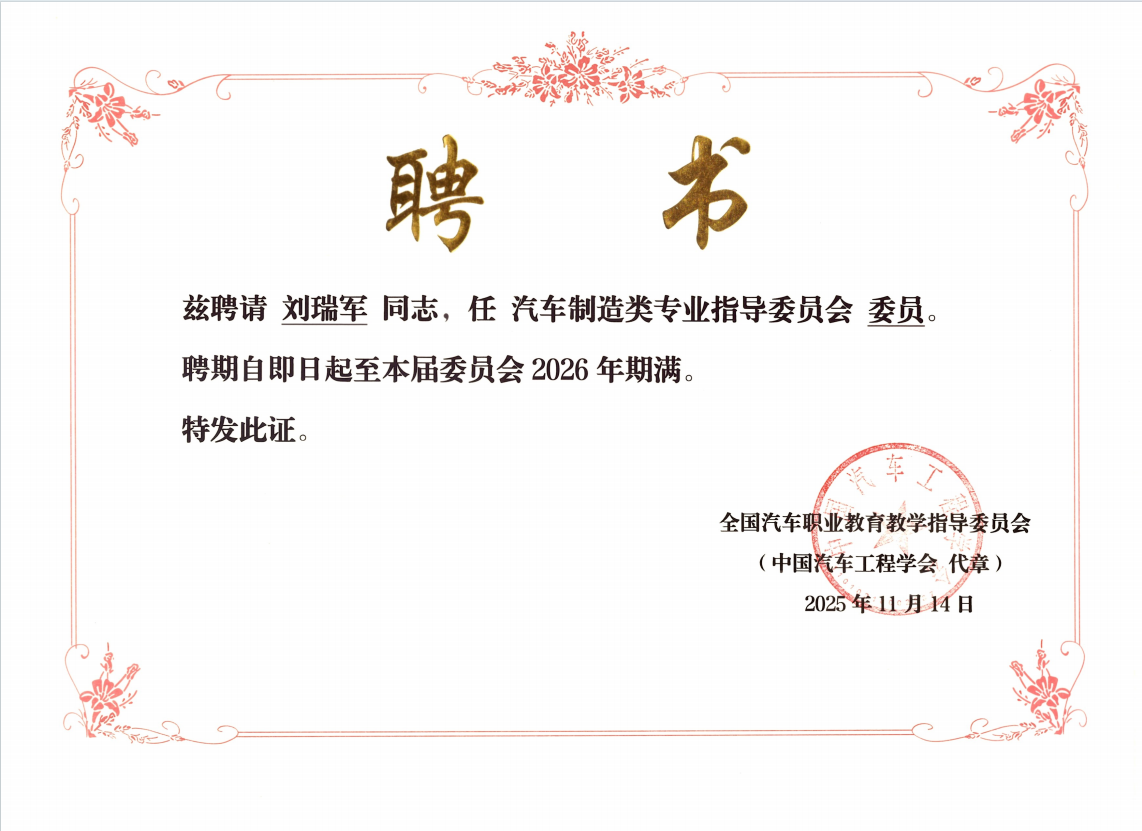 全国汽车职业教育教学指导委员会(以下简称“汽车行指委”)2025年全体委员工作会议传来喜讯,汽车学院院长刘瑞军同志成功当选为汽车行指委汽车制造类专业指导委员会委员。此次当选不仅为刘瑞军同志搭建了全国性的职业教育交流平台,更将为汽车学院的高质量建设与特色发展注入强劲动力、提供坚实支撑。