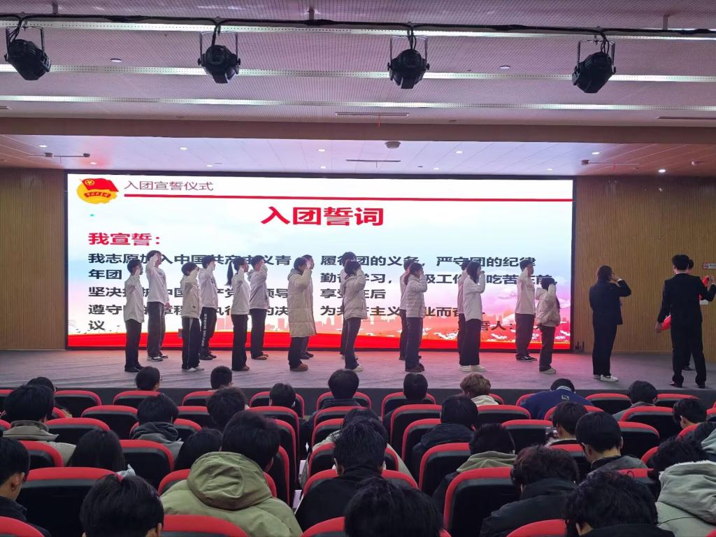 仪式在激昂奋进的《光荣啊,中国共青团》中拉开序幕。汽车学院团总支书记宣读新团员名单,优秀团员代表为新团员佩戴团徽、颁发团员证。熠熠生辉的团徽象征着责任与担当,接过团员证的瞬间,新团员们眼神坚定,脸上洋溢着自豪与憧憬。